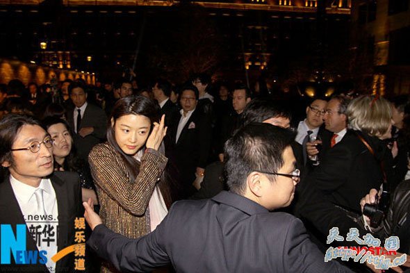 黎明早年和全智贤因合作广告而认识,今次在上海相遇,两人表现投契,大会安排德国“蜘蛛人”在酒店外墙表演,两人看得相当投入,全智贤更不时掩口,表情多多!今年初她拍摄电影《雪花与秘扇》时,曾到该酒店取景,因此获大会邀请出席开幕活动。