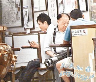 在凉茶铺与友人谈天的倪震,不时发短信向爱妻报告行踪