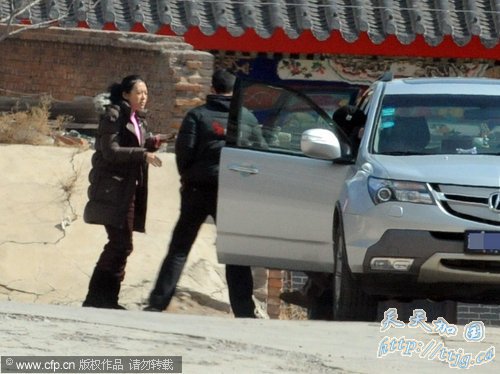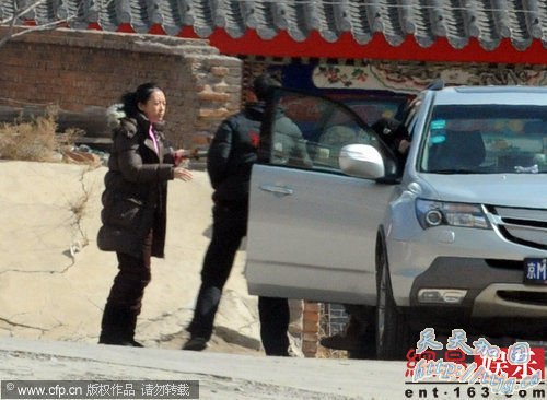 日前,记者专心守在剧组下榻的宾馆。某天上午十点左右,记者看到接送主演的专车停在了山庄门前,不一会郭富城先快步走出宾馆,他依然是前几天出现在记者眼前的那身装束,只是形象更邋遢了些。郭富城出门不久,一个穿着深色棉服、扎着马尾辫的女士走出门来,当她走到汽车前记者才认出她就是章子怡。章子怡当天棉服里面穿着粉红色羽绒坎肩,她的形象与郭富城一样邋遢,睡眼惺忪,脸也没洗,素面憔悴,与平时出席活动时光彩照人的形象相去甚远。章子怡坐上了副驾驶的位置,一上车她就仰躺在座位上,显得非常疲劳。