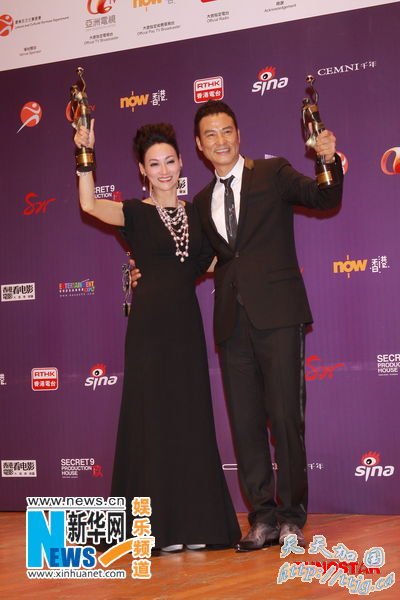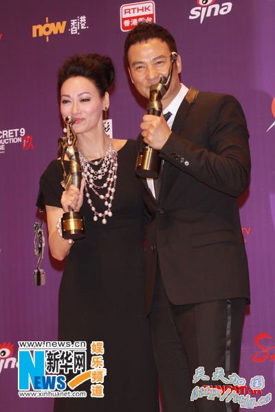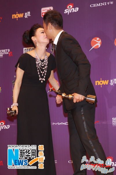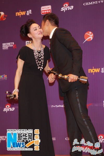 惠英红凭《心魔》获最佳女演员奖,任达华凭《岁月神偷》获最佳男主角奖。影帝拥揽影后亲吻奖杯,互相亲吻庆得奖。