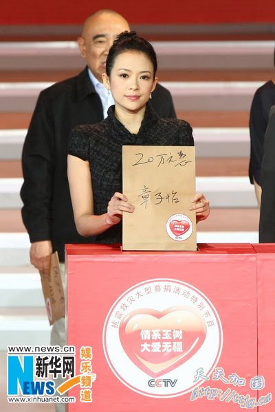 据悉,章子怡为了参加央视这次抗震救灾大型募捐活动特别节目,特意从《一代宗师》的辽阳片场连夜赶回北京。这也是今年年初她被曝出在戛纳借“5·12汶川大地震”诈捐风波后第一次在公众面前现身,以正面形象亮相央视并再度做慈善。