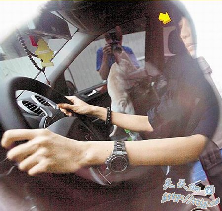 王心凌(箭头处)昨下午开车载爱犬回老家闭关疗伤。