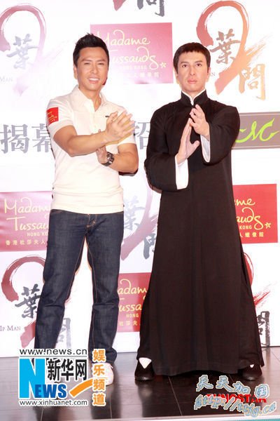 蜡像未揭幕前,子丹台上表示心情不算紧张,但很期待自己蜡像,问他觉得蜡像似自己吗?他说:都几似,眼神最似,不过他拍《叶问》时瘦一点。对于《叶问2》开画大收近400万,他表示很兴奋和开心,下星期会举行庆功宴。提到28号的优先场票房是否捐给青海地震灾民?他称是,但捐出多少钱,要待下星期庆功才公布。问他会请吃饭吗?他表示一定会,更说希望超过四千万票房,东方电影会请到日本玩,若果收超过五千万,王海峰请去欧洲玩。 子丹表示已联络身在上海的导演叶伟信,向他报喜。说到票房劲收,会否令他心动再拍第三集吗?他坦言暂时不会,问他是怕拍得多会变烂片吗?他说:《叶问》上映之后,好多人都拍,等于以前《黄飞鸿》一拍便几十部,不想一样去做。