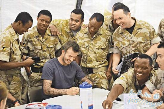 据报被阿盖德恐怖组织列作袭击目标的英国足球巨星贝克汉姆(David Beckham)日前突然深入阿富汗,探望在当地英军,又称自己“若不是为国家踢足球,就已为国家作战了”。穿上迷彩军裤和T恤的贝克汉姆魅力没法挡,无论军人们递上的是军服、旗帜、扑克牌甚至卫生纸,他都有求必应地笑着签名。