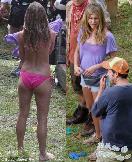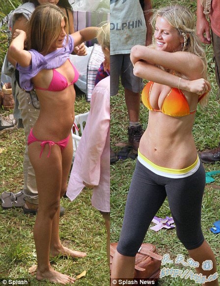 对于一个40多岁的女人来说,在年方20的嫩模面前穿比基尼无疑是场噩梦。但安妮斯顿可真不是一般的老女人:她胸前两片让人惊艳的粉红色比基尼文胸足以打败那个小模特。