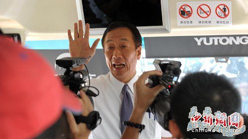 富士康科技集团总裁郭台铭现身深圳富士康厂,海内外200多名媒体记者围堵追访。中新社发 陈文 摄