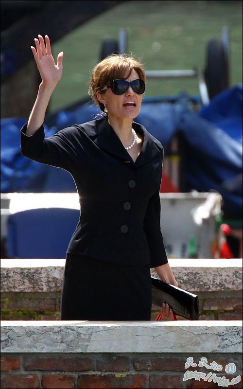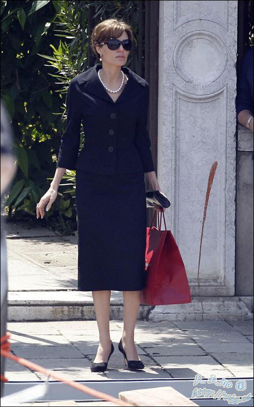 早前曝光的朱莉在威尼斯拍摄新片《游客》的全黑造型