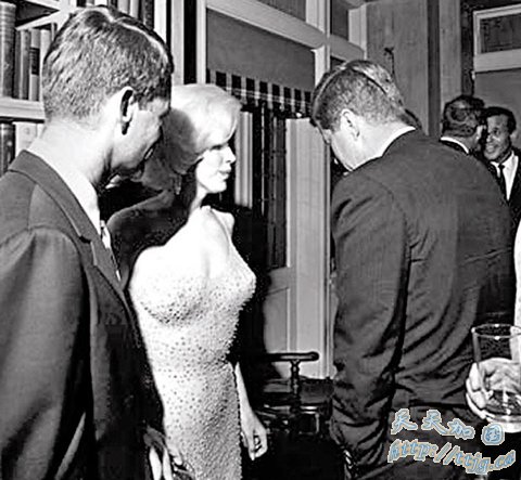 1962 年5月19日民主党筹款晚会上所拍,当时梦露刚向肯尼迪献唱生日歌。肯尼迪发现有镜头,刻意别过头去。
