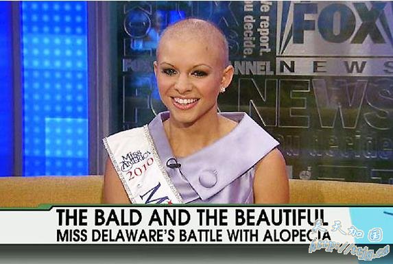 据美国福克斯新闻网29日消息,摘得“2010年特拉华州小姐”桂冠的卡伊拉自幼患有斑秃,是一位“光头美人”。虽然没有满头的秀发,但卡伊拉并不自卑,相反她的生活态度非常积极。在选美大赛的初始阶段,她曾一度成为争议人物。最终,她用自己的优雅消除了所有质疑。