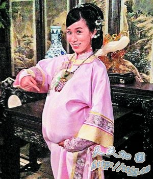 阿佘在微博上载了在古装剧中扮大肚婆的照片。