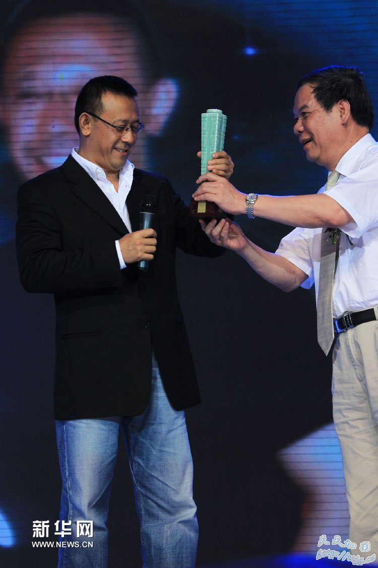 7月31日,电影人姜文(左)获颁“中国梦践行者”致敬杯。新华社记者 李明放 摄