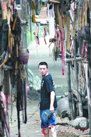 日前记者前往探营,发现“黑山村”场景与徐克程小东版本《倩女幽魂》中变化很大,没有老版中“黑山老妖巢穴”那么压抑黑暗,而是主打竹元素,在装饰上也跟老版不同,半空中到处悬挂着竹风铃,透着神秘而浪漫的气息。整个“黑山村”场景以紫色调为主,而居中的红灯楼也是全竹结构,从墙壁到楼梯都由竹子搭建。