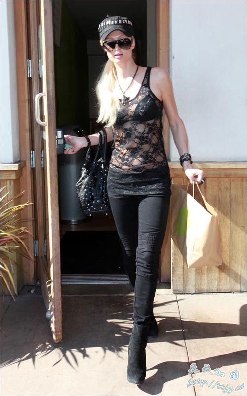 帕丽斯·希尔顿豪门千金绝对的拜金女,一件黑色的透明蕾丝上装配上了黑色的内衣.一件紧身的黑色长裤配上了脚踝靴子,虽然有些炎热,但是绝对够热辣性感,闷骚范十足。间谍帽更是让希尔顿想不成为明星都难。
