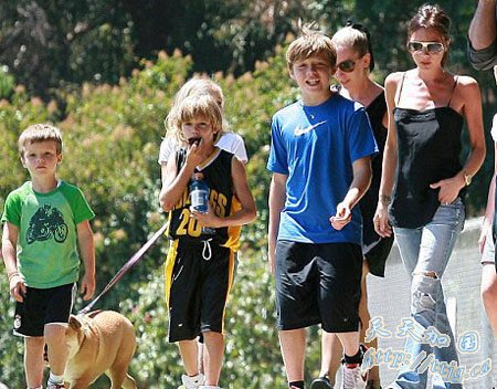 这应该也是贝克汉姆愿意看到的家庭和谐照片了。三个男孩一字排看走在路上,没有夸张的举止,没有疯跑,乖乖走在妈妈维多利亚身边。但36岁的辣妈维多利亚似乎还没有从上周五孩子们的顽皮不服管教中解脱出来,她身着撕裂的牛仔裤,穿黑色吊带背心,戴着太阳镜,低头闷闷不乐,甚至皱着眉头吮吸自己的手指。
