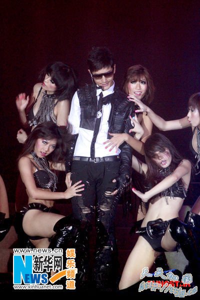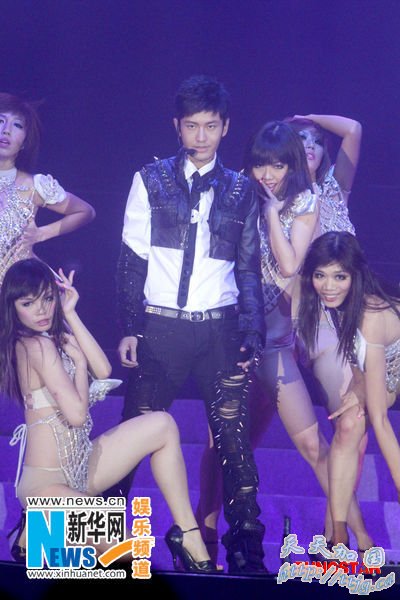打头阵的黄晓明率先献唱两首快歌,并与只穿胸围内裤的超性感舞蹈员大跳辣身舞,其中两个一身肉色舞衣出场,骤眼看上去就像没有穿衣服,其中一人更面对黄晓明大跳艳舞,更一度面向黄晓明的重要部位,动作十分不雅。