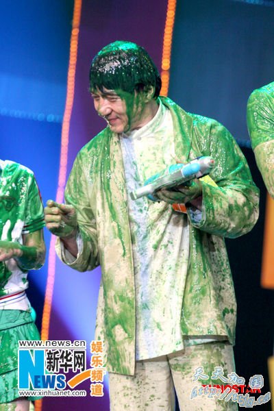 由央视少儿频道和MTV联手举办的2010未来星欢乐盛典昨晚在京举行。兴致高涨的孩子们用绿胶水款待每位到场的明星——成龙被泼成了“绿色落汤鸡”,现场笑果十足。