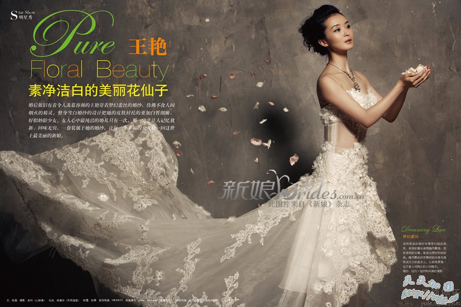 近日,王艳登上了杂志《新娘》的封面,并拍摄了一组唯美的婚纱大片,王艳身着梦幻蕾丝的婚纱,仿佛不食人间烟火的精灵,整身雪白婚纱的设计把她的皮肤衬托的更加白皙细嫩,素净美丽犹如花仙子降落人间,拥有无与伦比的名媛气质。