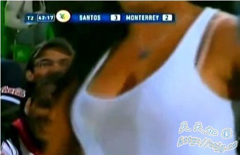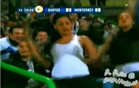 巴拉圭“乳神”里克尔梅终于不再孤独求败了,因为在南美赛场上她找到了最大的竞争对手。北京时间12月4日,在巴西联赛桑托斯与蒙特雷的比赛中,看台上的一位美女球迷在看到桑托斯队将比分反超后激动不已,撩起文胸露出乳房挑逗身后的男球迷,表达自己的喜悦之情。这一幕也被球场保安看在眼里,随后她因“举止不雅影响球迷看球”而被带离出场。