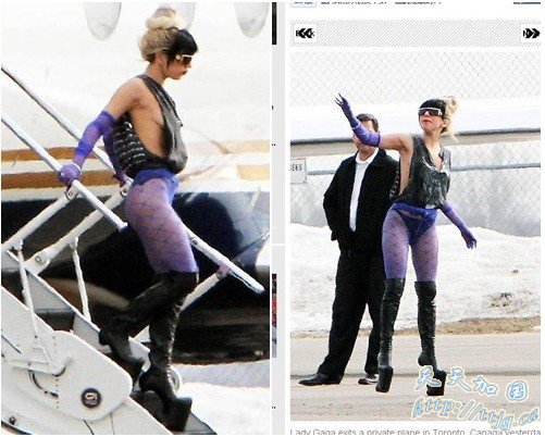 女神卡卡现身飞机场,竟在机场就摆起pose让知名摄影师李察森(Terry Richardson)拍摄,但她的妆扮实在很特异,上衣松松烂烂的好像塑胶袋,侧面真空半裸,下半身的紫色叁角裤配同色丝袜及长手套,脚下则踩着她最爱的高跷长靴。