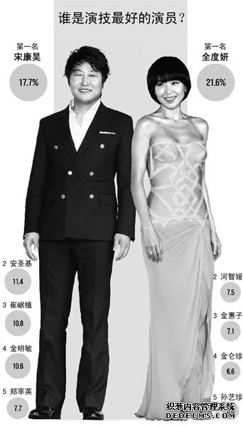 金明敏、薛景求、孙艺珍、宋康昊、秀爱、安圣基、元斌、全度妍、河正宇、河智苑(以上按韩语字母顺序排名)同时入选“最喜爱的演员”和“演技优秀的演员”名单。这些演员均出演过两部以上票房大作或话题作品。还有一些演员虽然没有入选人气排名,但在演技排名中占据一席之地。金惠子自出演《蛋黄酱》(1999年)后,时隔10年才出演电影《母亲》(2009年),但她被评为演技优秀的女演员第3位(7.1%)。另外,位列演技排名第10(3.0%) 的徐英姬的知名度也不太高,但她凭借去年出演的《金福南杀人事件始末》荣获各种奖项。获得最佳韩国导演殊荣的是林权泽(17.4%)。除了去年执导票房赢家《大叔》的李政范导演以外,奉俊昊、姜帝圭、康祐硕、李沧东等知名导演均进入前十。