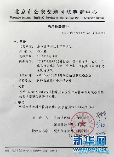 高晓松的酒精检验报告(5月10日摄)