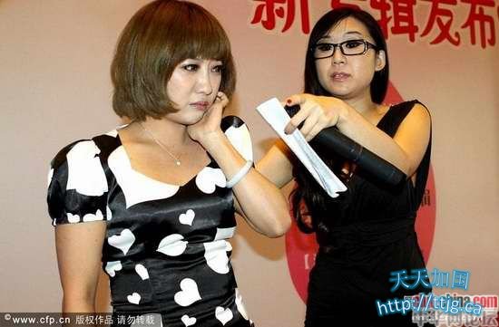 2011 年5月28日,北京,80后女歌手戊道子举办新专辑发布会。发布会上,戊道子与歌迷们亲切互动。谁知在发布会快结束时,一名男子闯入会场,并企图强行带走戊道子,在遭到戊道子的拒绝后,该男子动手打了戊道子一个耳光,并用“你以为你是谁”等词侮辱戊道子。该男子被保安推出场外后乘坐保时捷离开。图为打人男子在扇了戊道子一个巴掌后欲再动手,身边的其他人紧紧拉住他。