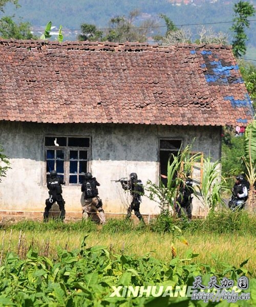 电视画面显示,在印尼首都雅加达东南400多公里处的中爪哇省淡满光地区贝吉村,全副武装,着黑衣的警察包围一座有红色屋顶的房子。围困房屋十余小时后,警察向房内开火,打飞房屋木制构件。房内冒出黑烟。