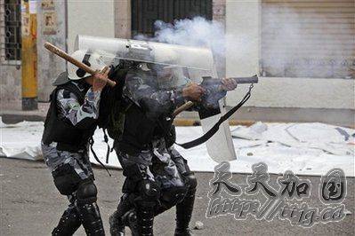 洪都拉斯防暴警察与示威者发生激烈的冲突