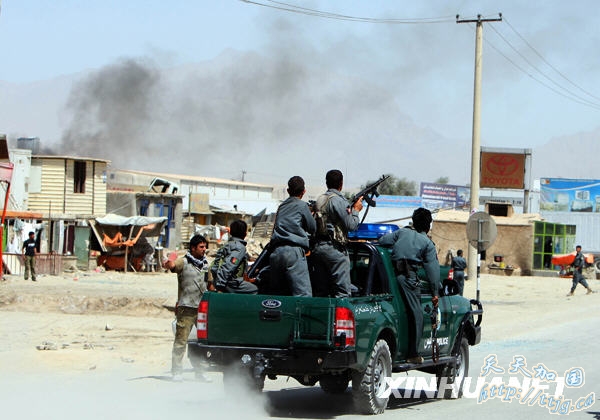 8月18日,在阿富汗首都喀布尔,一些警察和士兵在事发现场执勤。 新华社/法新