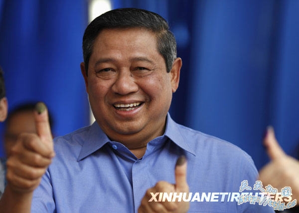 8月18日,印度尼西亚大选委员会正式宣布,现任总统苏西洛及其竞选搭档布迪约诺在7月8日举行的总统选举中获胜。这是苏西洛(左)和夫人在印尼首都雅加达一处投票站准备投票的资料照片(2009年7月8日摄)。新华社记者岳月伟摄