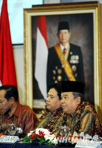 8月18日,在印度尼西亚首都雅加达,印尼大选委员会主席安沙利(右)宣布选举结果。当天,印度尼西亚大选委员会正式宣布,现任总统苏西洛及其竞选搭档布迪约诺在7月8日举行的总统选举中获胜。新华社记者岳月伟摄