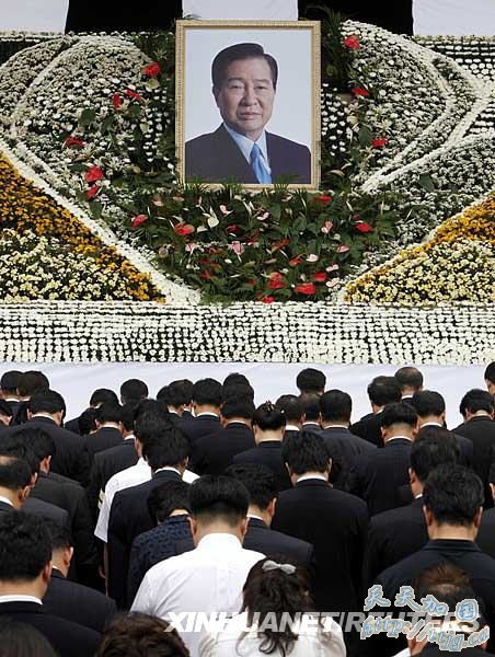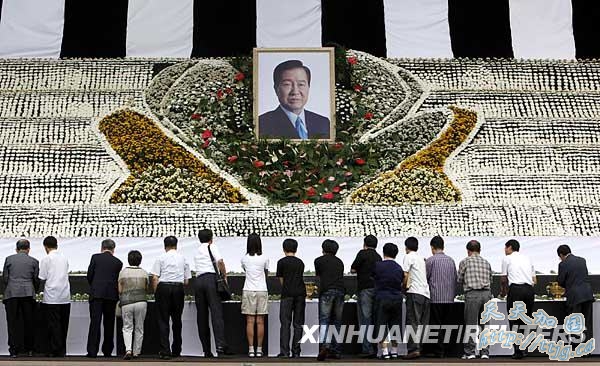 8月19日,在韩国首都首尔市政厅广场搭建的祭坛前,悼念者在已故韩国前总统金大中的遗像前默哀。