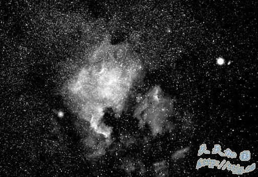 北美洲星云是很多人天空中的最爱,它的命名原因显而易见。这个星云几乎延伸到墨西哥湾,它非常大,因此很难拍摄,但是这张照片非常美丽。这张照片不是用数 码相机拍摄的,而是利用经过特殊处理的胶卷,让它对光更加灵敏。不知为什么,这个胶片让北美洲星云显得更加丰富多彩,更加温暖,即使它并不是彩色照片。在 30分钟的曝光过程中,摄影师非常小心地对望远镜进行了手动操作。