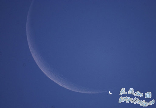 这张图片上有从地球附近飞越的金星和我们的卫星——月球。然而这次让人感到意外的是,图中最大的天体不是太阳,而且是月球:偶尔金星和月球在天空中排成一 条直线,组成这张令人震惊的图案,不过事实上它们之间相距数千万公里。当月球和金星位于同一位置时,会发生这种现象,此时距离我们非常遥远的金星看起来离 月球更近。与金星相比,月球显得是如此暗淡:金星反射的阳光平均是月球的5倍。使这张照片显得更令人吃惊的是,这台望远镜是第一次进行观测。