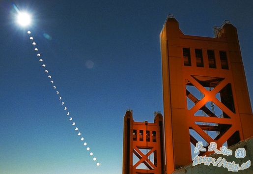 日食非常罕见,地球上一年只发生一两次。这张照片是把2002年6月10日从美国加利福尼亚州萨克拉曼多的塔桥(Tower Bridge)上仰望天空拍摄的日偏食照片进行多重曝光合成的。摄影师在两个小时里,每隔5分钟利用太阳滤光器拍摄一次照片,组成这张由陆地和宇宙构成的美丽景观。