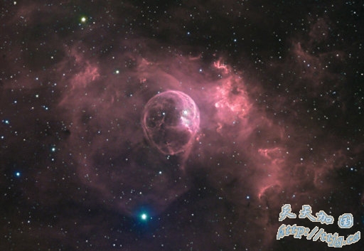 以前在照片中很难看到这个令人过目难忘的泡沫星云,但它是恒星形成小“工厂”的完美实例。那颗炙热庞大的恒星SAO 20575正在向外喷发大量亚原子粒子;大规模太阳风把它周围的气体吹成这个直径达1光年的泡沫星云。
