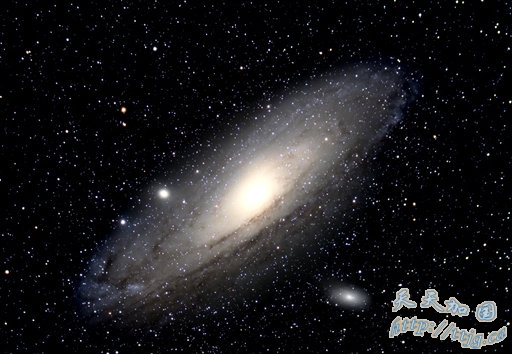 仙女座星系M31是距离我们最近的巨型螺旋星云。因此它是天体摄影爱好者最喜欢观测的对象,然而迄今为止很少有照片像这张一样美丽。从这张照片上看,M31布满尘埃的螺旋臂非常突出,它的两个椭圆形侏儒同伴也能看到。NGC 205位于这个螺旋星云明亮的核心右侧;M32隐藏在M31左侧的螺旋臂下。这张照片的纵深度很好,非常清晰,从中可以看到很遥远的地方。这张照片告诉我们,即使是熟悉的物体,也能成为美的源泉。