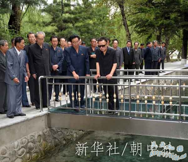 这张朝鲜中央通讯社19日播发的照片显示,朝鲜最高领导人金正日(前)视察位于平安北道的球场郡养鱼场。