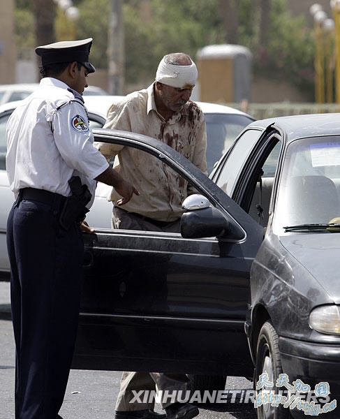 8月19日,在伊拉克首都巴格达财政部附近,一名交警帮助一名在爆炸袭击中受伤的男子。伊拉克内政部19日发布的最新消息说,巴格达市中心当天发生的两起爆炸袭击事件已造成95人死亡、563人受伤。