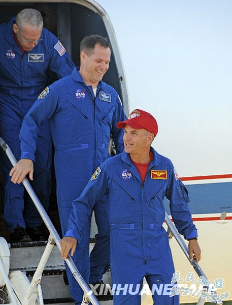 8月19日,在美国佛罗里达州卡纳维拉尔角肯尼迪航天中心,“发现”号航天飞机宇航员挥手致意。经过为期两天的评估,美国航天局当日表示,“发现”号航天飞机可以按计划于美国东部时间8月25日1时36分(北京时间13时36分)发射升空。新华社/路透