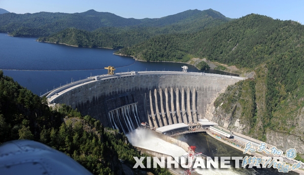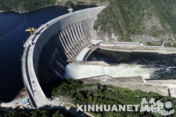 这是8月20日从空中拍摄的俄罗斯西伯利亚地区哈卡斯共和国境内的萨彦-舒申斯克水电站大坝的照片。