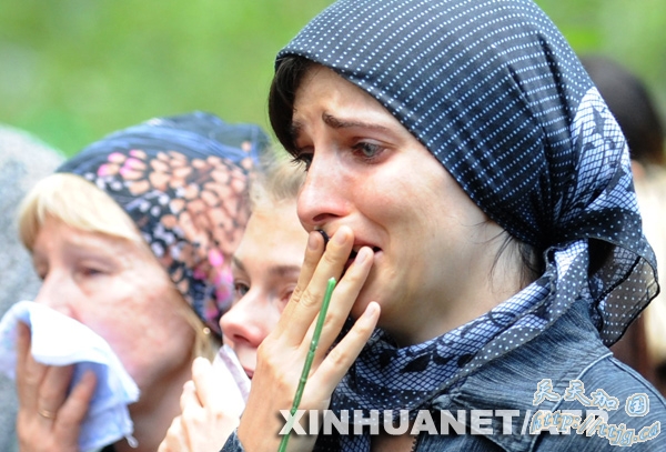 8月19日,在俄罗斯西伯利亚地区哈卡斯共和国萨彦-舒申斯克水电站附近的马伊纳村,事故遇难者的亲属在葬礼上哭泣。