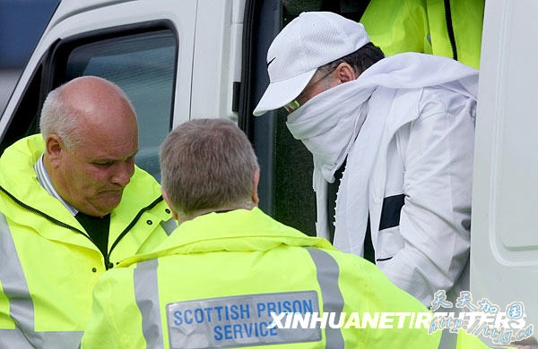 8月20日,在英国苏格兰的格拉斯哥机场,制造洛克比空难的利比亚特工迈格拉希(中)准备乘专机离开。英国苏格兰司法部长麦卡斯基尔当日宣布,在苏格兰服刑的迈格拉希身患晚期前列腺癌,经过利比亚官员与苏格兰司法部门的协商,双方同意提前结束迈格拉希在苏格兰的刑期,将其释放。1988年12月,美国泛美航空公司一架客机在苏格兰洛克比镇上空爆炸,造成机上和地面共270人丧生。