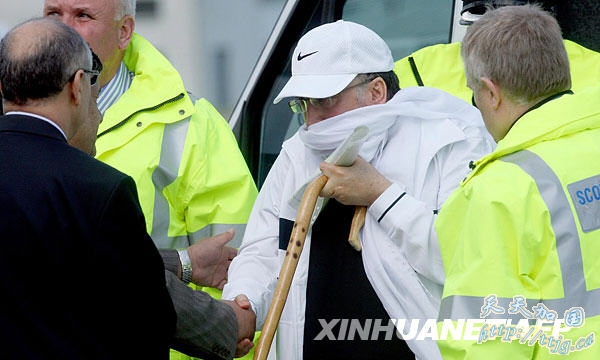 8月20日,在英国苏格兰的格拉斯哥机场,制造洛克比空难的利比亚特工迈格拉希(右)准备乘专机离开。英国苏格兰司法部长麦卡斯基尔当日宣布,在苏格兰服刑的迈格拉希身患晚期前列腺癌,经过利比亚官员与苏格兰司法部门的协商,双方同意提前结束迈格拉希在苏格兰的刑期,将其释放。1988年12月,美国泛美航空公司一架客机在苏格兰洛克比镇上空爆炸,造成机上和地面共270人丧生。
