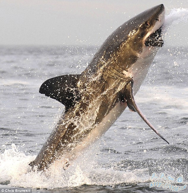 在摄影师Chris Brunskill的镜头中,大白鲨虽然体形硕大,捕食时却身手矫健,纵身跃出水面6米高,张开大嘴将它的“美食”紧紧咬在口中。
