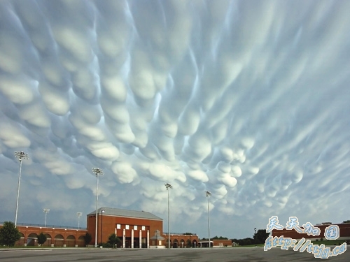 当寒冷、充满水汽的空气从暴风云上部快速下沉时,就会形成乳房云。湿冷空气快速下降就会形成类似奶牛乳房的向下的凸起。当崎岖不平模样的乳房云形成时,通常会发生暴风雨,并伴随着雷暴现象。此名字来自拉丁语“乳房”。图片显示的是2004年6月美国内布拉斯加州一座体育场上空的壮美景象。
