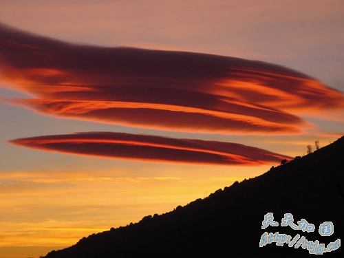 西班牙南部山区上空的荚状高积云。在如血夕阳的照射下,云彩像被涂上了一层色彩,宛如粉色UFO。荚状云的云块呈豆荚形或椭圆形,盘旋于高空中。荚状高积云在多山地区会经常出现。由于它们不同寻常的形状,因此它们经常被误认为是UFO。