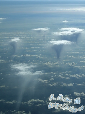 云中的冰晶以降水形式下落,却在降到地面之前蒸发,形成雨幡洞云。它们就像云朵伸向大地的触角,有时令云彩看上去就像漂浮在空中的巨大水母。