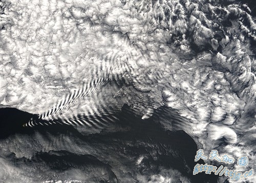 这是南印度洋上一个火山小岛—阿姆斯特丹岛上空的波浪云。湿润的云层在小岛上空经过时,湿润空气上升和下降形成了这种狭长的透镜状云彩。