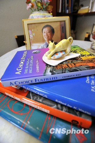 “光纤之父”高锟和夫人在美国硅谷的寓所内,陈列着光纤样品和其英文著作。中新社发 陈钢 摄